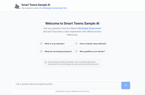 Smart Towns developed a demonstration AI chatbot that allows users to ask plain-language questions about the Alberta Municipal Government Act and receive clear, accessible responses. This project serves as a proof of concept for how municipalities can use AI-powered chatbots on their websites to help residents quickly find information about bylaws, policies, and municipal services—reducing staff workload while improving public access to information.